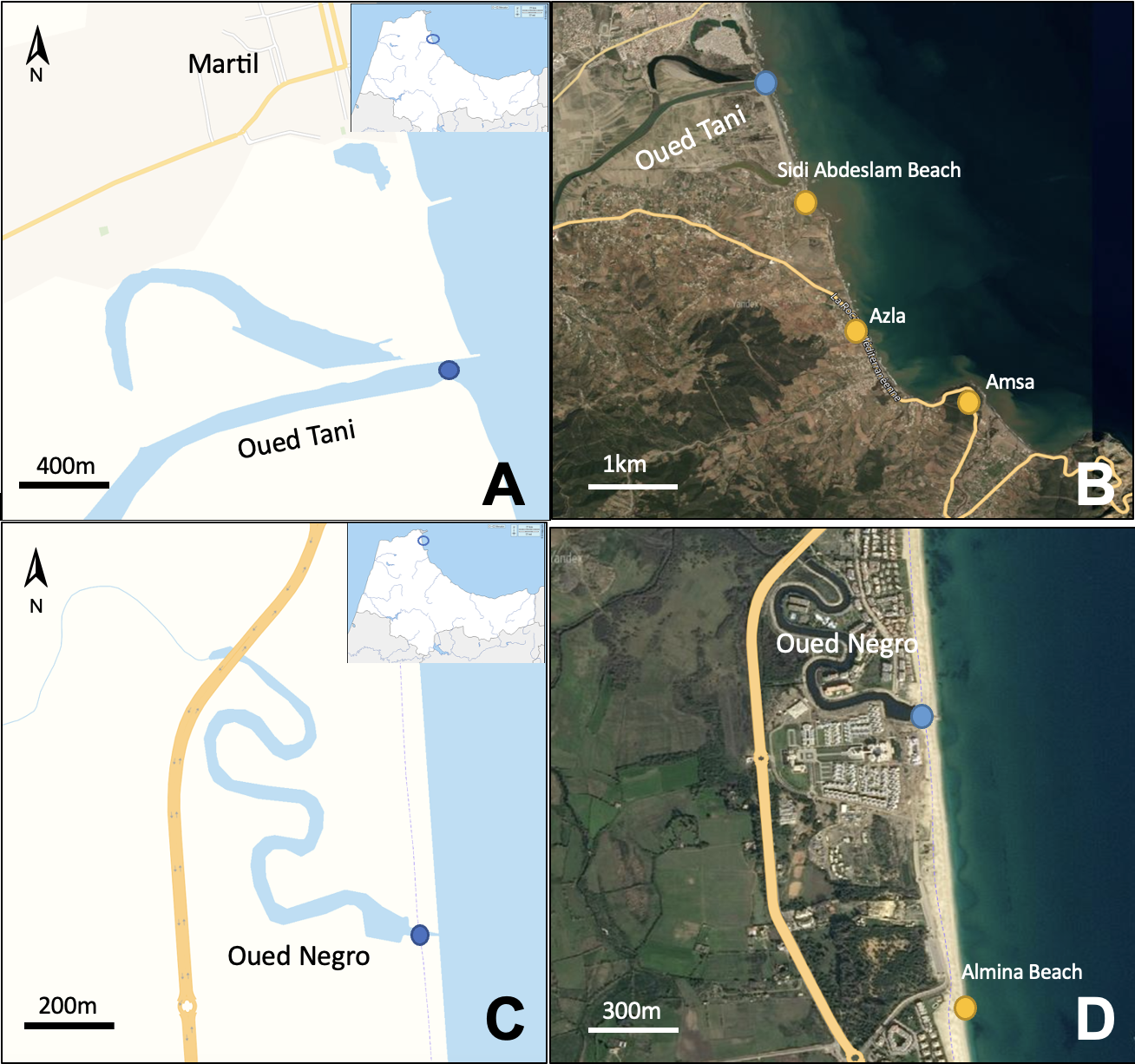 Map showing the localitiesĀ of the study sites. A Mouth of Tani River (Martil); B Locations of the occurrence of Callinectes sapidus in Amsa, Azla and Sidi Abdeslam BeachesĀ (yellow dots) and Oued Tani Martil (blue dot); C Mouth of Negro River (Fnideq); D Locations of the occurrence of Callinectes sapidus in Almina Beach (yellow dot) and Oued Negro Fnideq (blue dot). |