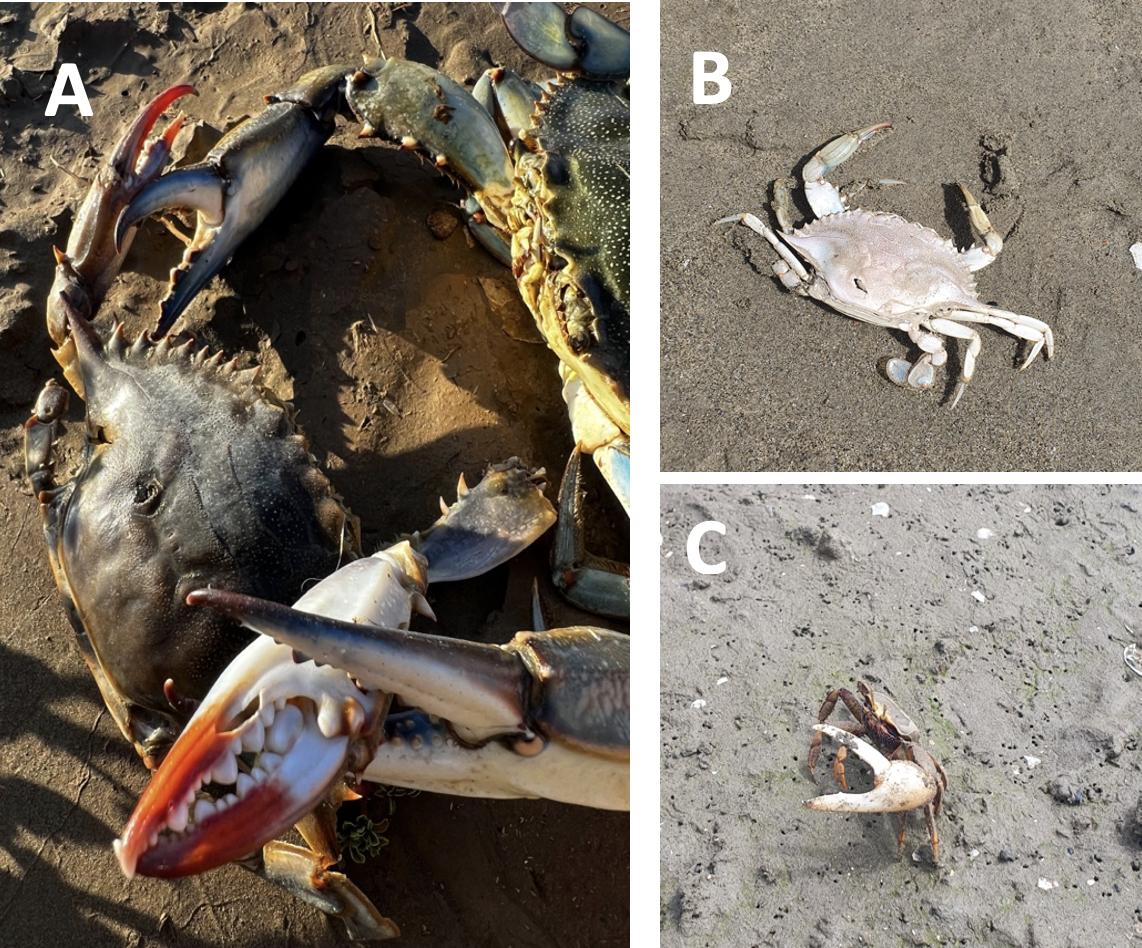 A Aggressive blue crab male in competition with a female one and shows cannibalism and scavenger behaviour; B Occurrence of molts in Oued Tani, Martil; C Native crab Uca tangeri in Oued Tani. |