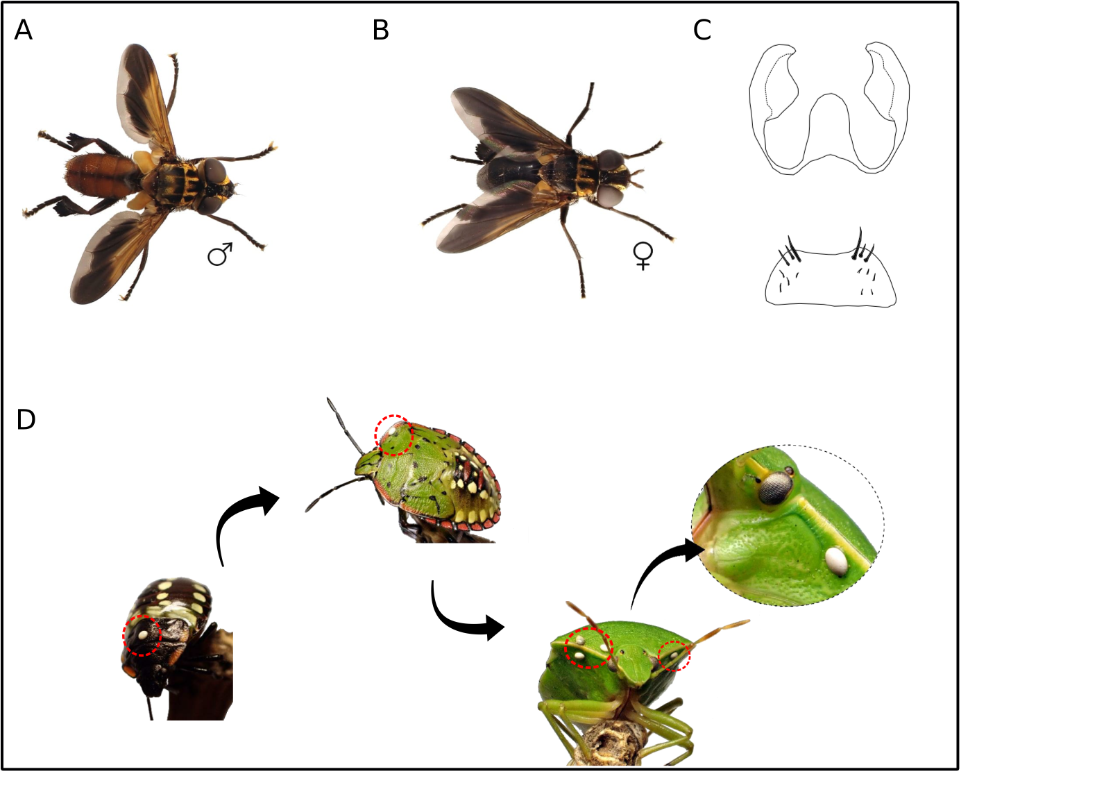 Habitus, genitalia and life cycle (partial) of Trichopoda pictipennis. A Male of Trichopoda pictipennis, photo by Pablo Caloca; B Female of Trichopoda pictipennis, photo by Pablo Caloca; C Female genitalia of Trichopoda pictipennis; D Parasitised individuals of Nezara viridula at different life stages, photo by Pablo Caloca. |