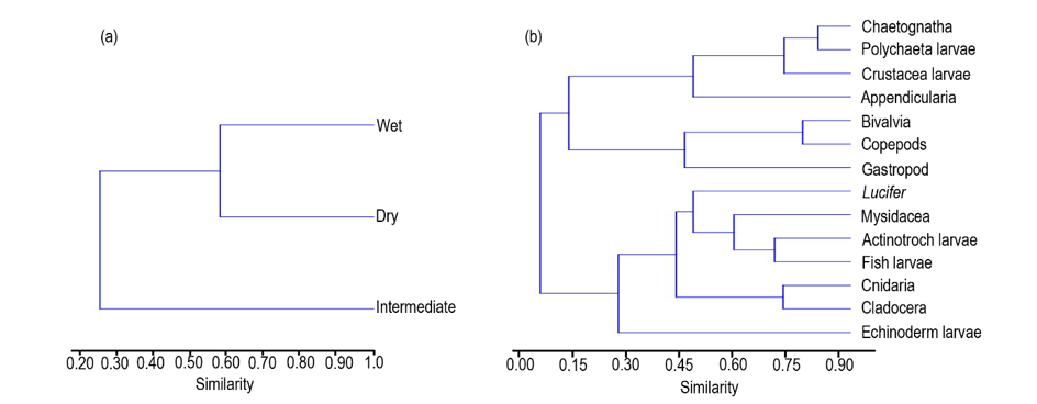 Dendrogram of cluster analysis using Bray-Curtis similarity distance, based on zooplankton density in Lawas seagrass area for different (a) seasons and (b) zooplankton groups. |