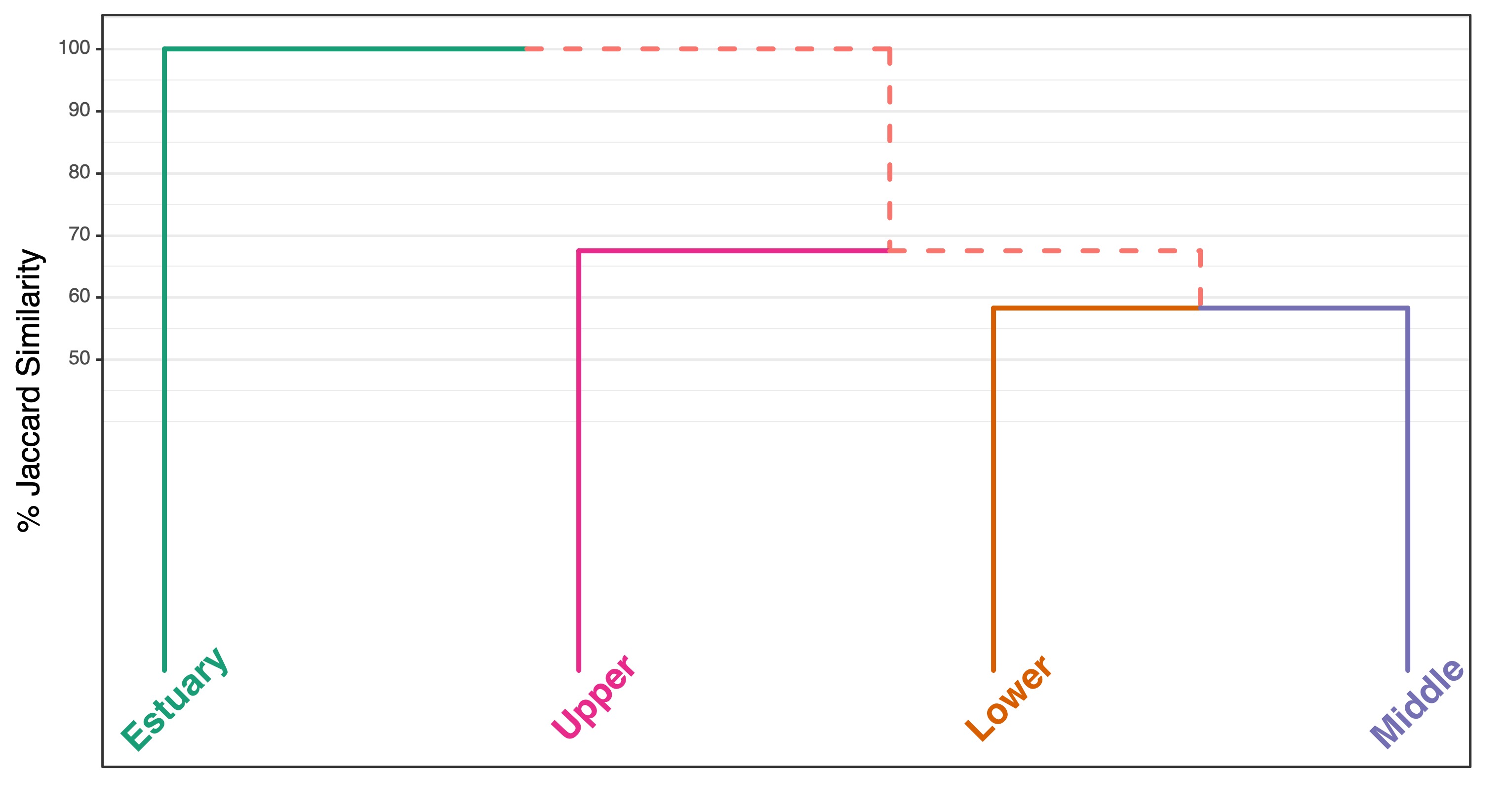 Hierachial cluster diagram of fish assemblage based on Jaccard Index per basin section using species presence-absence data. |