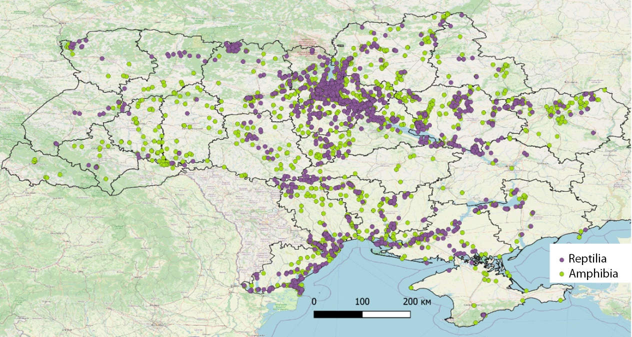 Map of records of studied representatives of herpetofauna (amphians - Amphibia; reptiles - Reptilia) on the territory of Ukraine. |